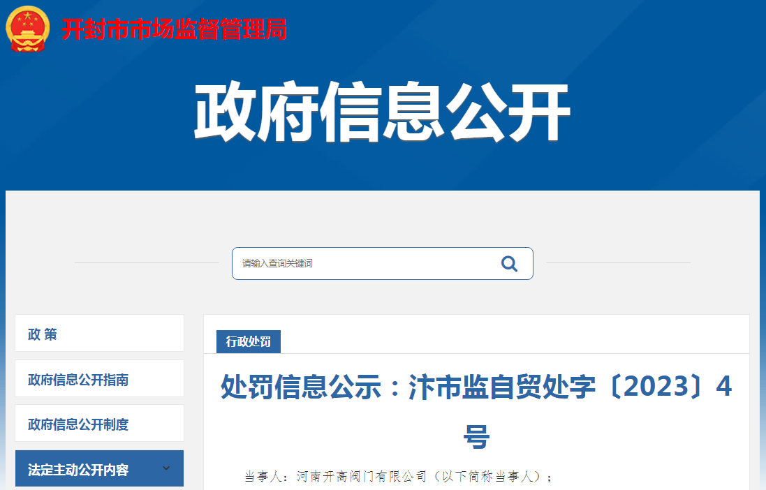 中国质量新闻网讯 2023年2月22日,河南省开封市市场监督管理局发布关于河南开高阀门有限公司的处罚信息汴市监自贸处字〔2023〕4号。