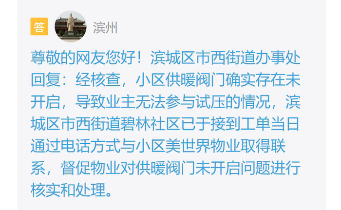 收到留言后,滨州市滨城区市西街道办事处进行了办理并回复:经核查,小区供暖阀门确实存在未开启,导致业主无法参与试压的情况,滨城区市西街道碧林社区已于接到工单当日通过电话方式与小区美世界物业取得联系,督促物业对供暖阀门未开启问题进行核实和处理。