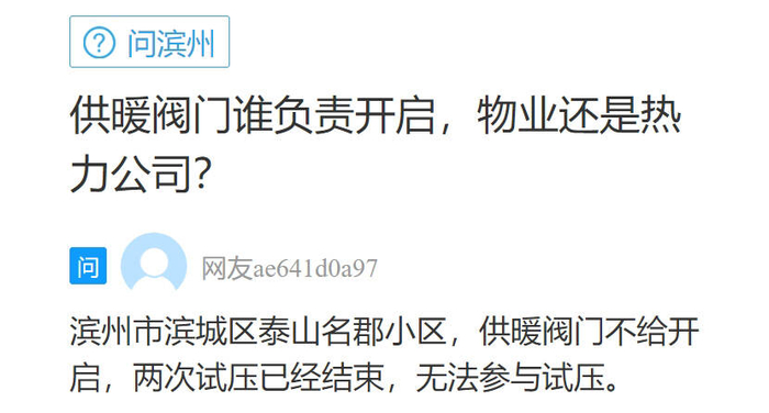 齐鲁网·闪电新闻11月9日讯 滨州的一位网友在闪电新闻网络问政平台留言:滨州市滨城区泰山名郡小区,供暖阀门不给开启,两次试压已经结束,无法参与试压。