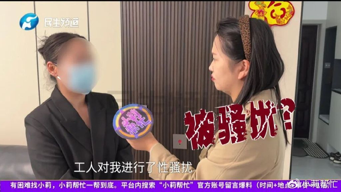 白女士告诉小莉,11月12日家里的供暖的阀门漏水,联系小区物业后,物业又找了施工方的工人上门进行维修,可没想到维修工人在施工过程中对自己进行了性骚扰!